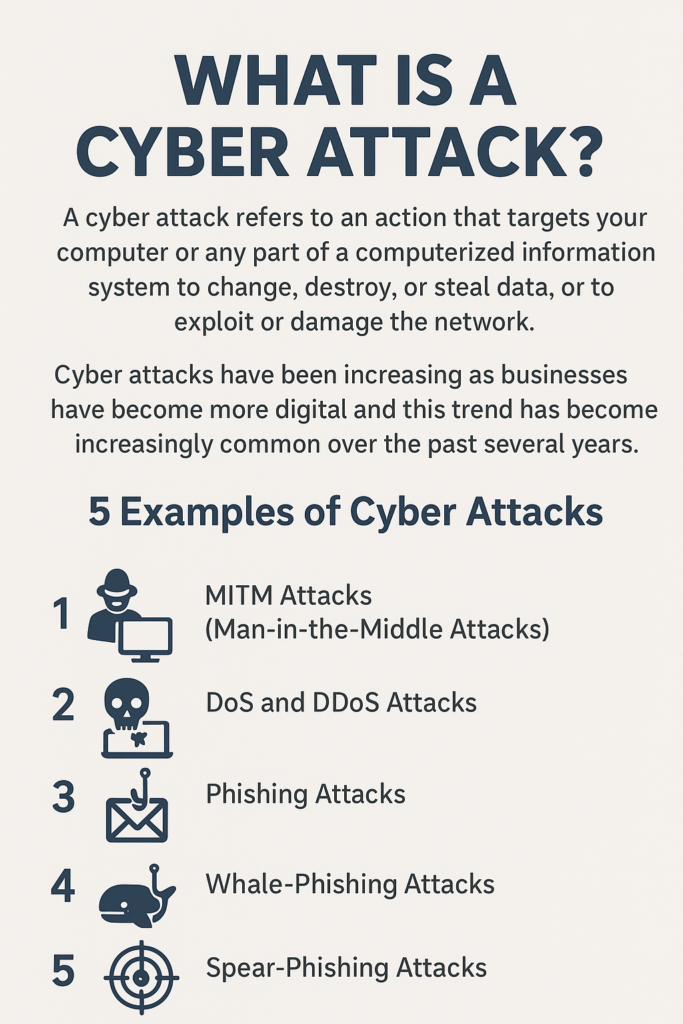 A cyber attack refers to an action that targets your computer or any part of a computerized information system to change, destroy, or steal data, or to exploit or damage the network. Cyber attacks have been increasing as businesses have become more digital and this trend has become increasingly common over the past several years.